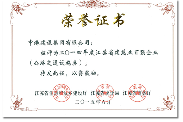 2015年6月11日,由江蘇省住房和城鄉建設廳、江蘇省統計局、江蘇省商務廳共同舉辦的全省建筑業創新發展暨2014年度百強企業發布會在南京隆重召開,會上,中港建設集團有限公司被評為“二0一四年度江蘇省建筑業百強企業”,這是江蘇省公路交通設施類唯一一家獲此殊榮的企業,集團公司總裁秦高舉參加了大會并領取證書和獎牌。
