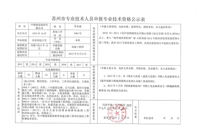 專業技術人員申報專業技術資格公示表—李永強